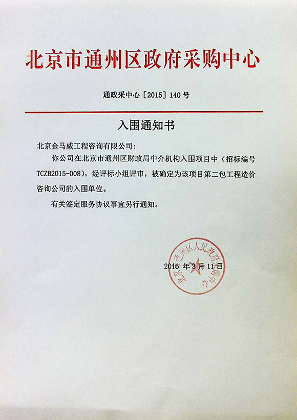 3月11日,經(jīng)公開招標(biāo),公司入圍“北京市通州區(qū)財政局中介機(jī)構(gòu)入圍評選采購項(xiàng)目”(招標(biāo)編號:TCZB-2015-008)。據(jù)了解,一共有多家工程造價咨詢公司參與了投標(biāo),北京金馬威工程咨詢有限公司經(jīng)評標(biāo)小組評審,被確定為該項(xiàng)目第二包工程造價咨詢公司的入圍單位。