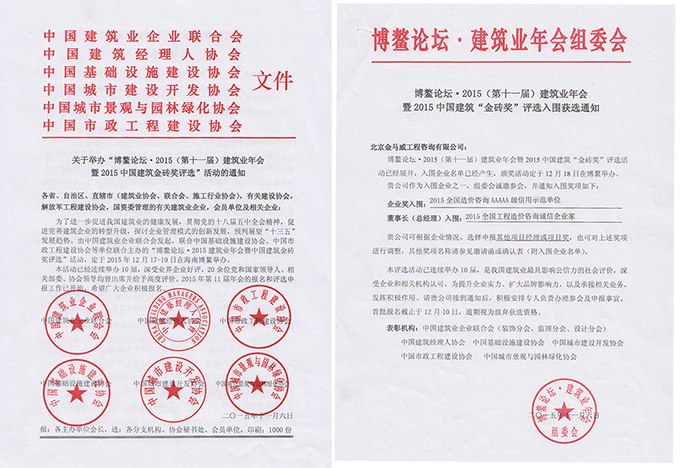 金馬威工程咨詢有限公司入圍“2015建筑業(yè)年會暨中國建筑金磚獎”2015全國造價咨詢AAAAA級信用示范單位,周和生董事長入圍“2015建筑業(yè)年會暨中國建筑金磚獎”2015全國工程造價咨詢誠信企業(yè)家。