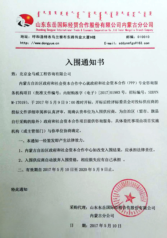 2017年5月10日,內(nèi)蒙古自治區(qū)政府和社會(huì)資本合作中心就政府和社會(huì)資本合作(PPP)專業(yè)咨詢服務(wù)機(jī)構(gòu)項(xiàng)目,開(kāi)標(biāo)后經(jīng)評(píng)標(biāo)委員會(huì)對(duì)投標(biāo)供應(yīng)商的投標(biāo)文件詳細(xì)審閱和認(rèn)真評(píng)審,確認(rèn)我公司入圍“內(nèi)蒙古自治區(qū)政府和社會(huì)資本合作專業(yè)咨詢服務(wù)機(jī)構(gòu)項(xiàng)目”(招標(biāo)編號(hào):SDDYNM-17019)。
